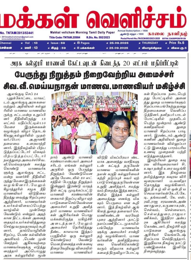 BC MBC Welfare Minister Siva. Vee. Meyyanathan - Donated Student's Benches - 24.09.2025